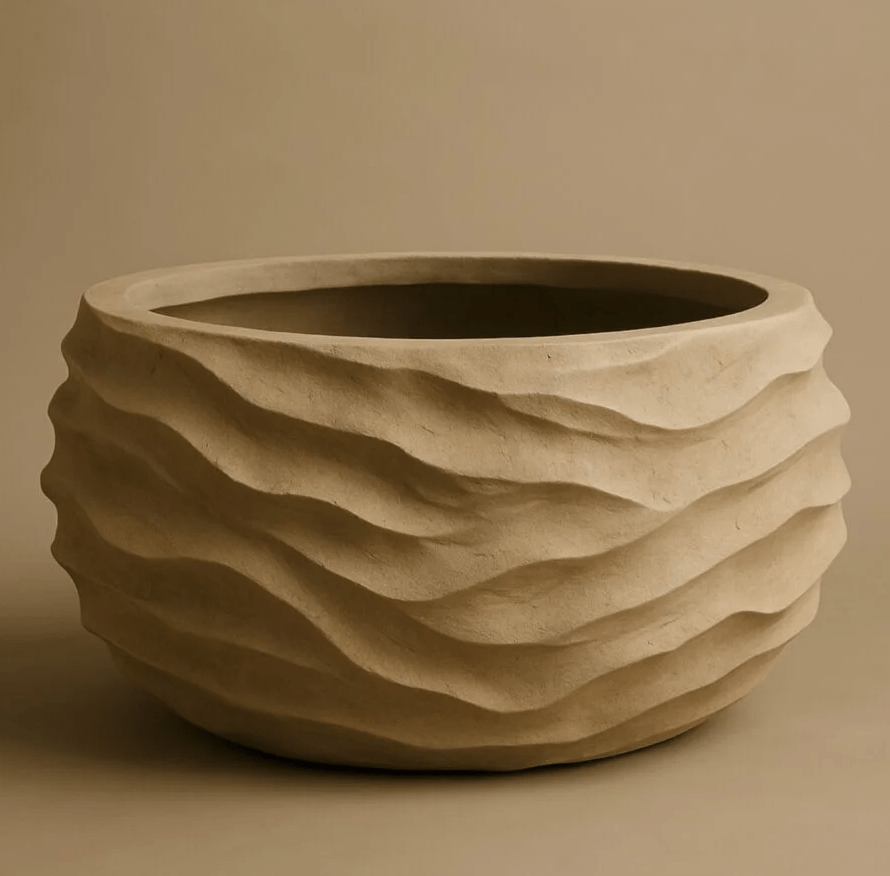 Vela wirkt wie vom Wind geformt – mit weichen, fließenden Linien, die sich sanft um den Körper des Gefäßes legen. Die wellenartige Oberfläche verleiht ihm Leichtigkeit und Bewegung, fast wie eine Erinnerung an Dünen oder Wasserläufe. Der helle Ton unterstreicht die ruhige Ausstrahlung, ohne sich in den Vordergrund zu drängen. Vela bringt eine poetische, fast meditative Präsenz in jeden Raum – und setzt Pflanzen elegant in Szene.